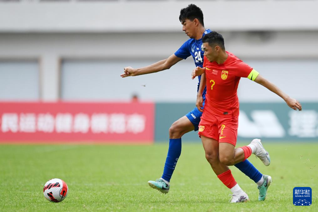 9月10日,中国队球员艾菲尔丁·艾斯卡尔(右)和乌兹别克斯坦队球员里扎库洛夫在比赛中拼抢。