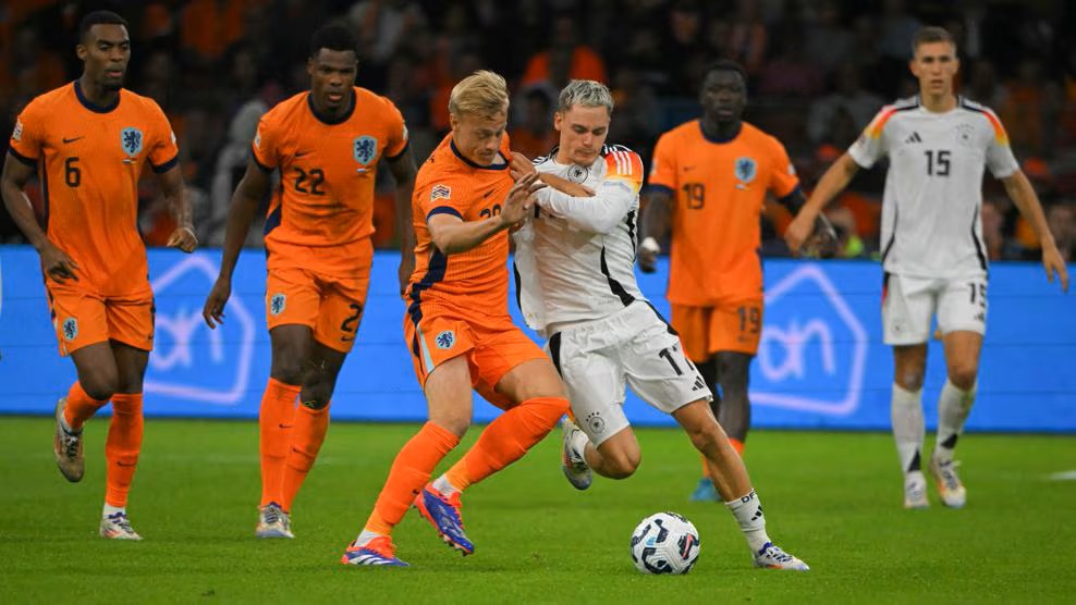 在A级联赛中,荷兰队主场迎战德国队,开场仅2分钟就取得进球。赫拉芬贝赫送出直传,赖恩德斯中路低射得手。第38分钟,德里赫特后场出球失误,德国队就地反击,翁达夫射门扳平比分。上半场补时阶段,劳姆禁区左侧横扫门前,翁达夫传球到后点,基米希打空门得手,德国队2:1反超。
