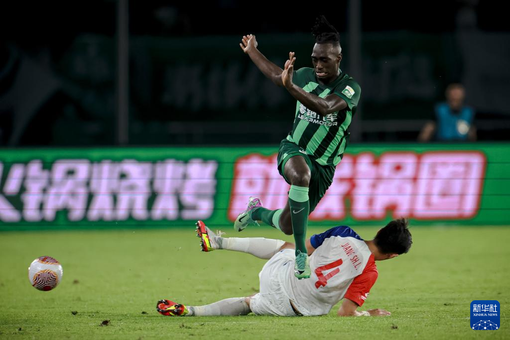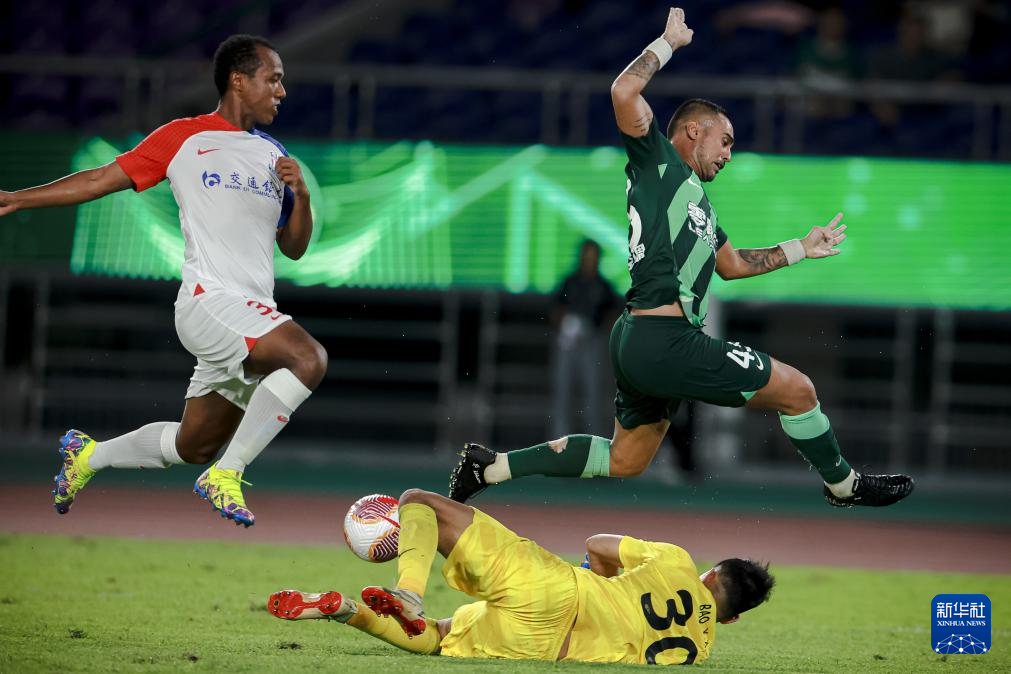 9月13日,浙江队球员埃弗拉(左二)在比赛中射门得分。新华社记者 江汉 摄