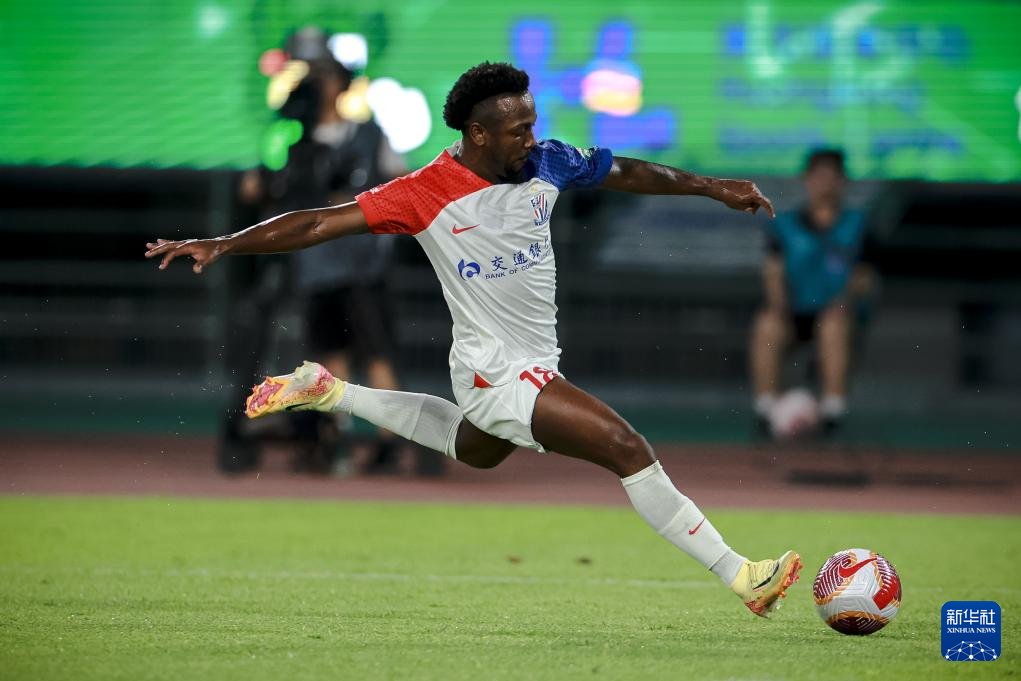9月13日,上海申花队球员安德烈·路易斯(左)在比赛中射门得分。新华社记者 江汉 摄
