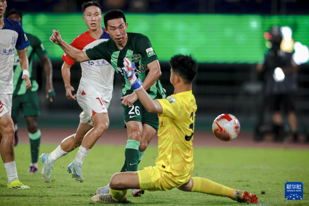 9月13日,浙江队球员孙国文(右二)在比赛中射门得分。新华社记者 江汉 摄