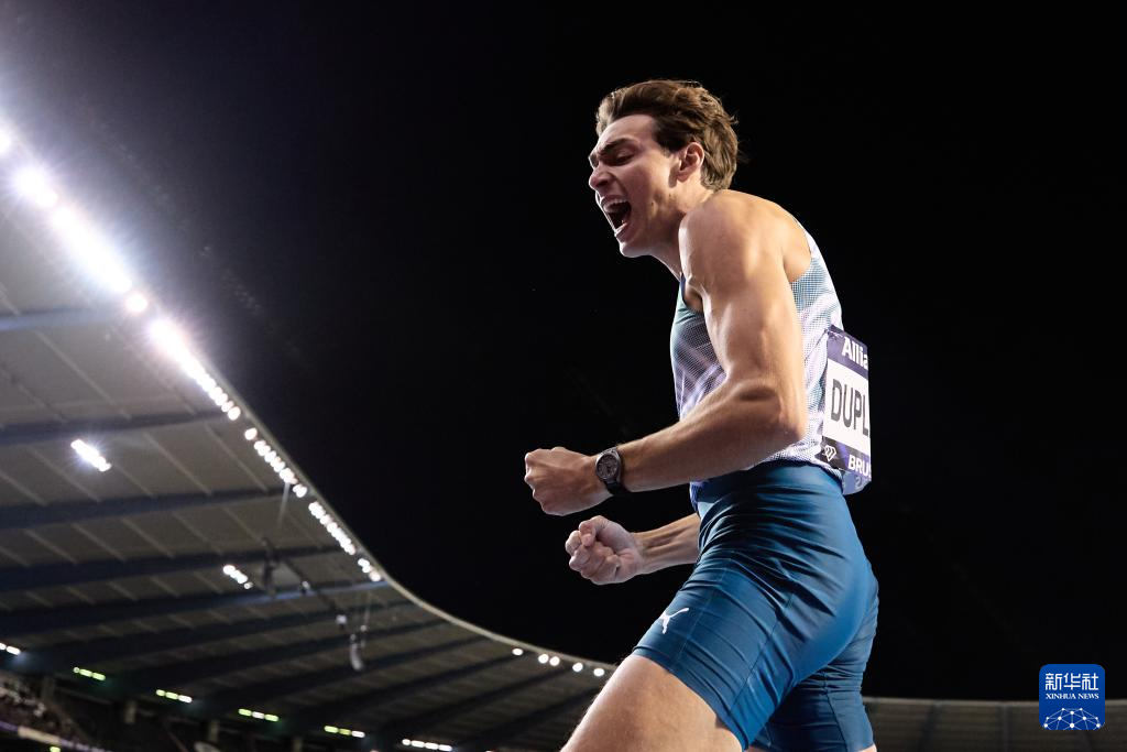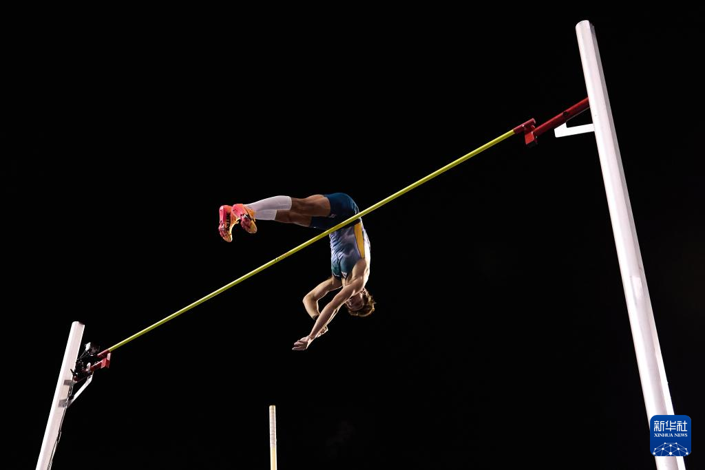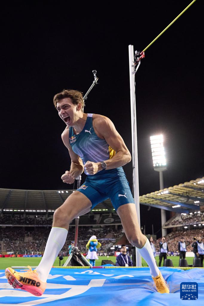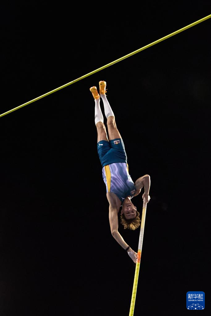 9月13日,瑞典选手杜普兰蒂斯在男子撑杆跳高决赛中。最终,他以6米11的成绩夺得冠军。新华社记者 孟鼎博 摄