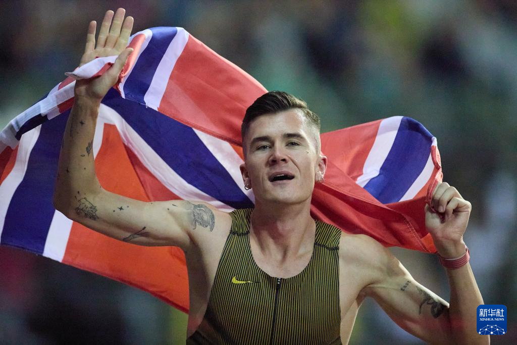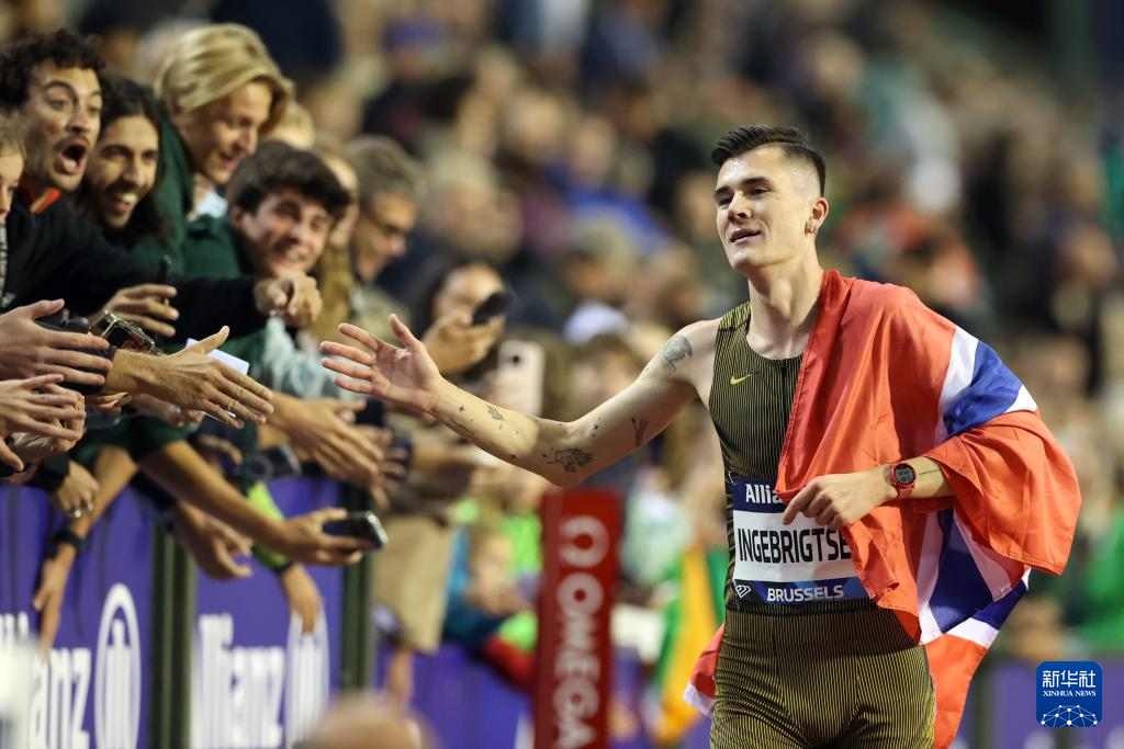 9月13日,挪威选手因格布莱特森在男子1500米决赛后庆祝。最终,他以3分30秒37的成绩夺得冠军。新华社记者 孟鼎博 摄