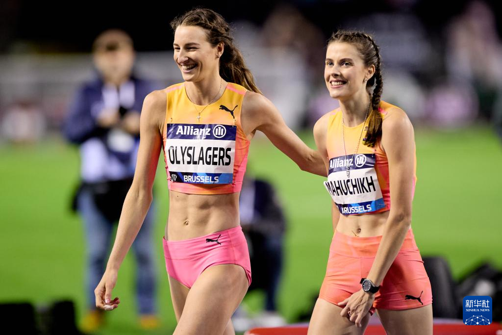 9月13日,冠军乌克兰选手马胡齐克(右)与亚军澳大利亚选手奥利斯拉格斯在女子跳高决赛后相互致意。新华社记者 孟鼎博 摄