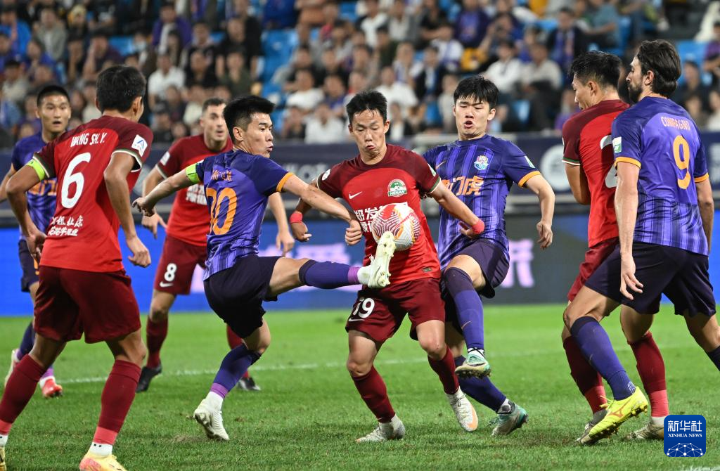 9月14日,天津津门虎队球员王秋明(左四)在禁区内防守。新华社记者 孙凡越 摄