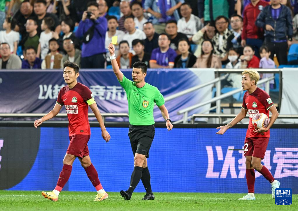 9月14日,本场主裁判梁财伟(中)向河南俱乐部酒祖杜康队球员王上源(左)出示黄牌。新华社记者 孙凡越 摄