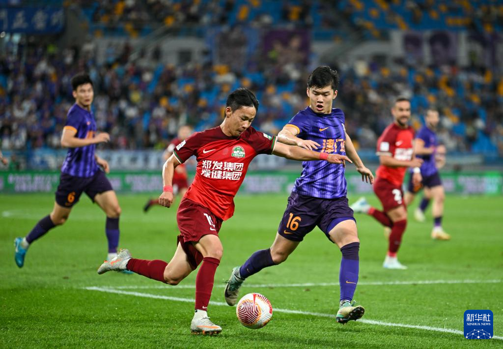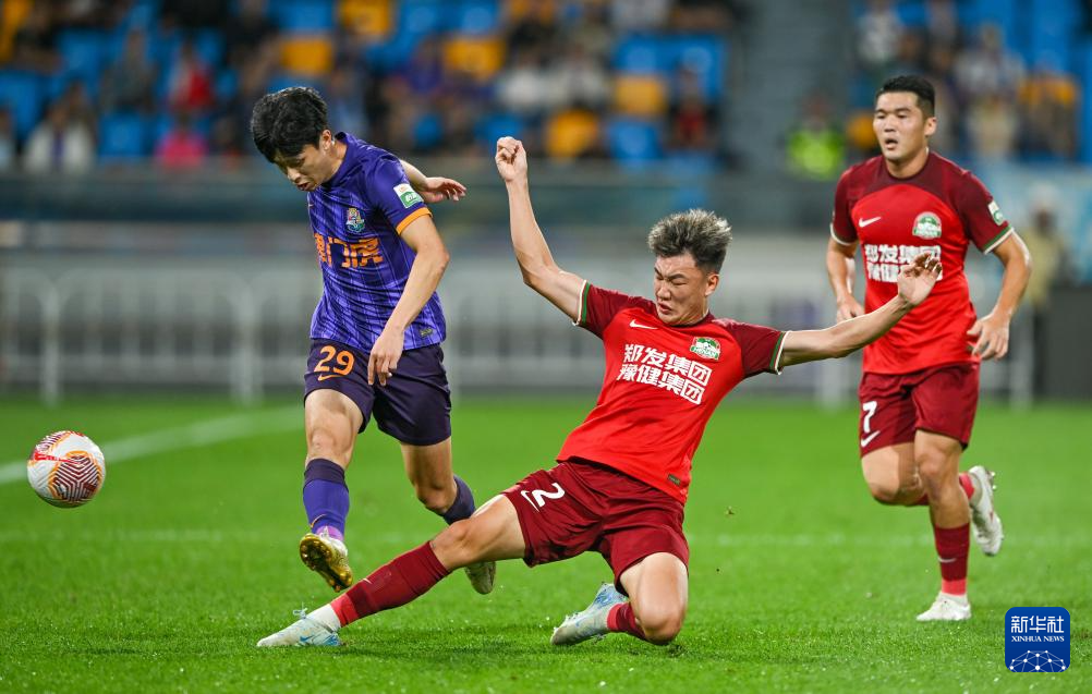 9月14日,河南俱乐部酒祖杜康队球员尼曼贾·科维奇(右)在比赛中射门。新华社记者 孙凡越 摄