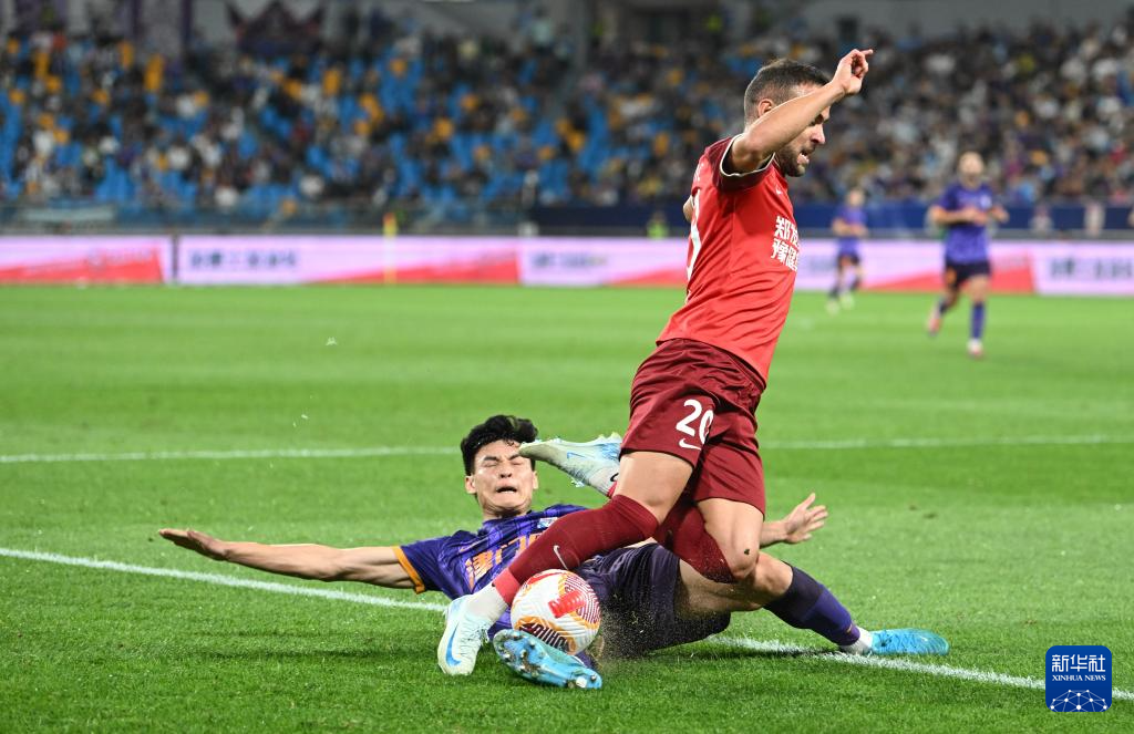 9月14日,天津津门虎队球员什科里奇(右)在比赛中铲断河南俱乐部酒祖杜康队球员黄紫昌。新华社记者 孙凡越 摄