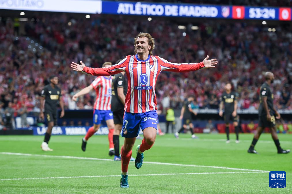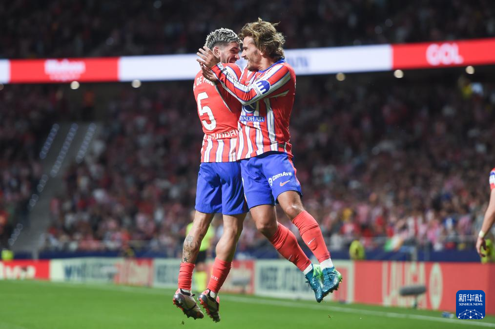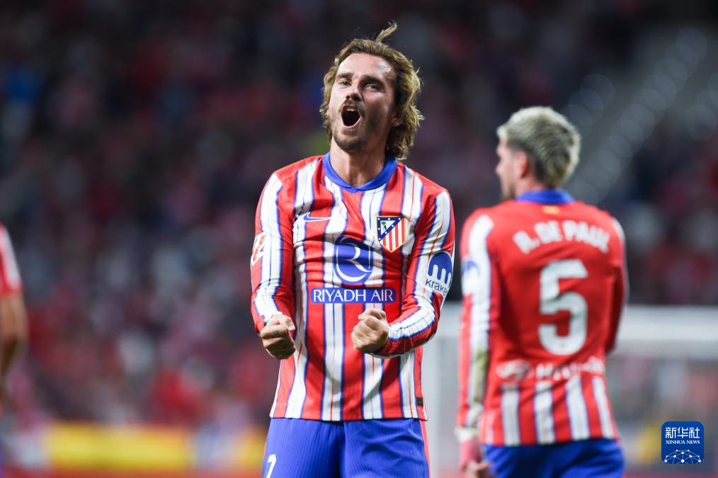 9月15日,马德里竞技队球员格列兹曼在比赛中庆祝进球。新华社发(古斯塔沃·巴连特摄)