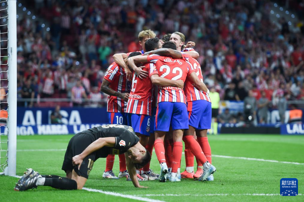 9月15日,马德里竞技队球员在比赛中庆祝进球。新华社发(古斯塔沃·巴连特摄)
