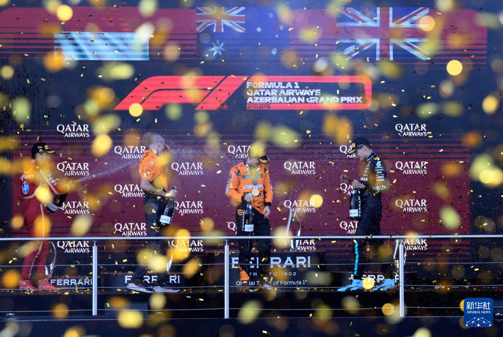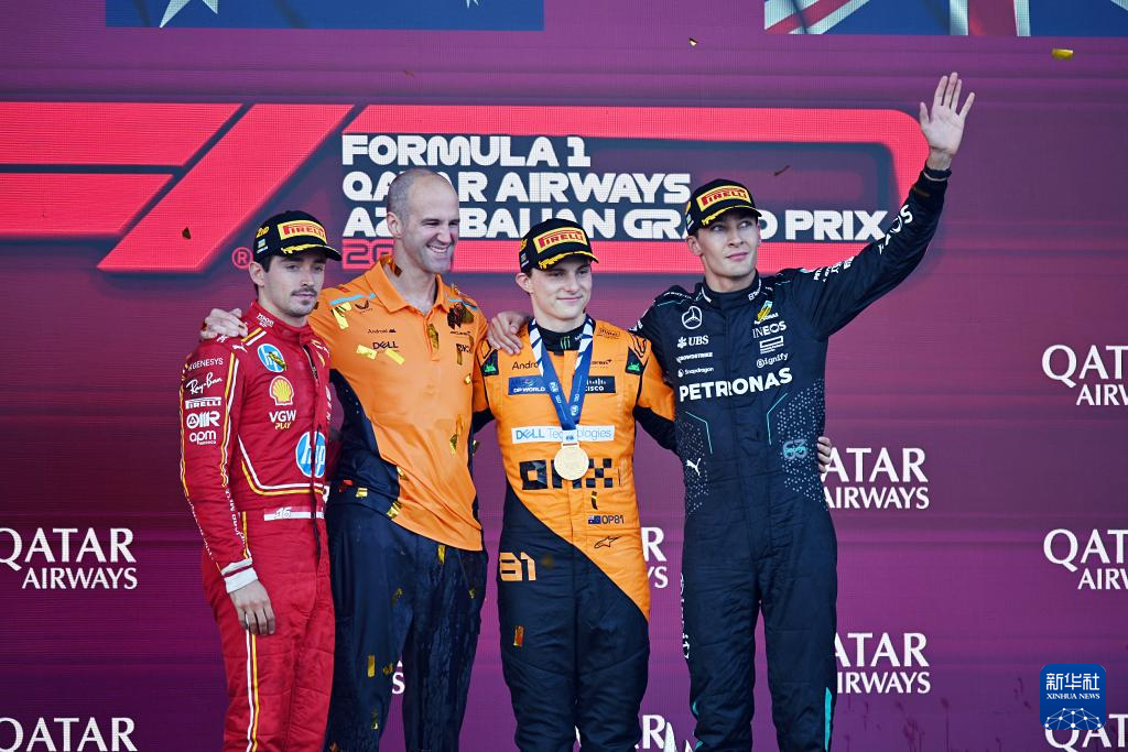 9月15日,冠军迈凯伦车队澳大利亚车手皮亚斯特里(右二)、亚军法拉利车队摩纳哥车手勒克莱尔(左一)和季军梅赛德斯车队英国车手拉塞尔(右一)颁奖仪式上庆祝。新华社发(托菲克·巴巴耶夫摄)