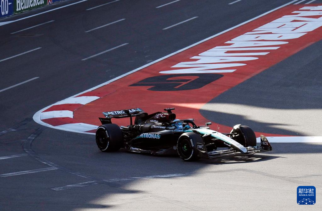 9月15日,梅赛德斯车队英国车手拉塞尔驾驶赛车在比赛中。最终,他获得季军。新华社发(托菲克·巴巴耶夫摄)