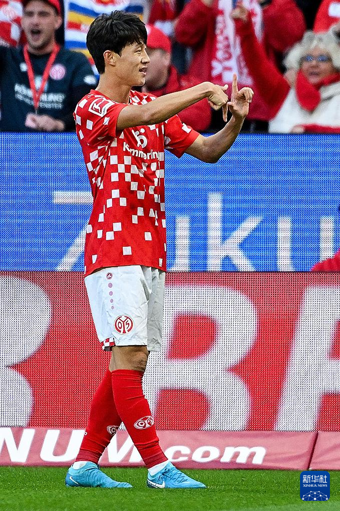 9月15日,美因茨队球员李在城进球后庆祝。新华社发(乌尔里希·胡夫纳格尔摄)