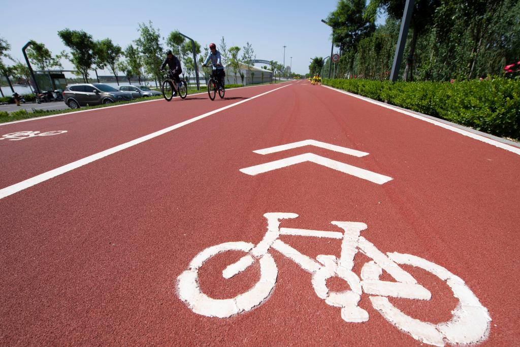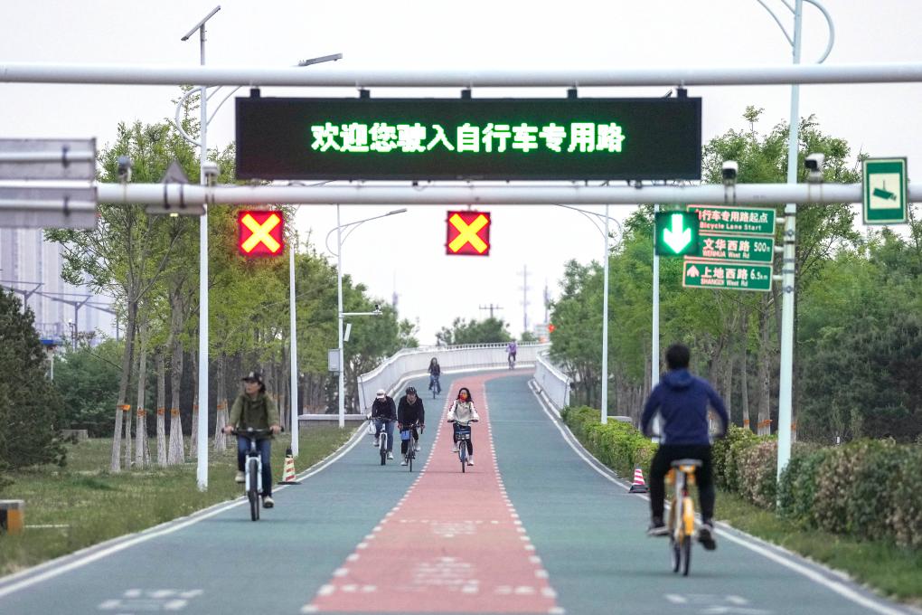 2023年4月27日,在北京自行车专用路上骑行通勤的市民。这是国内首条通勤用自行车专用路。新华社记者 鞠焕宗 摄