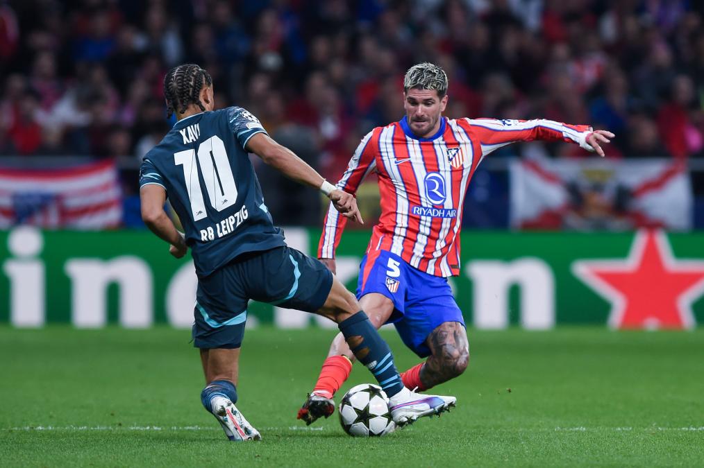 9月19日,马德里竞技队球员德保罗(右)与莱比锡队球员哈维·西蒙斯拼抢。新华社发(古斯塔沃·巴连特摄)