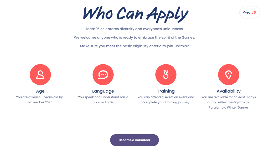 米兰冬奥会志愿者计划招募1.8万人,他们将被冠以“26之队(Team26)”的称号。申请者需在2025年11月1日年满18岁,意大利本土和外国人均可,至少要会意大利语或英语,能够自行承担签证、机票和住宿等费用。组委会将提供工作制服和相关培训。