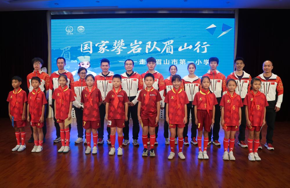 9月13日,国家攀岩队成员与眉山市第一小学的学生代表合影。当日,在2024中国攀岩联赛揭幕战(四川眉山站)开赛前夕,国家攀岩队队员走进眉山市第一小学,与学生互动交流。新华社发(张忠萍摄)