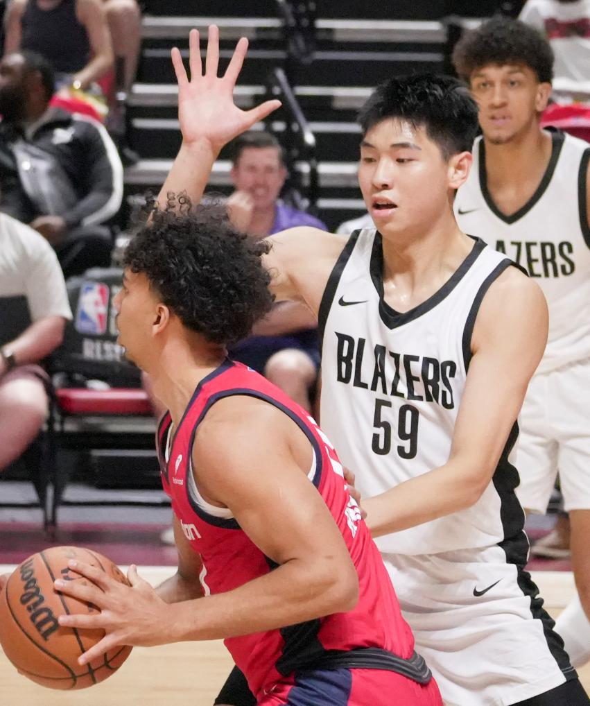 7月16日,崔永熙(前右)在比赛中防守。当日,在NBA夏季联赛中,中国球员崔永熙所在的波特兰开拓者队82:80战胜华盛顿奇才队。新华社发(孙宇轩摄)