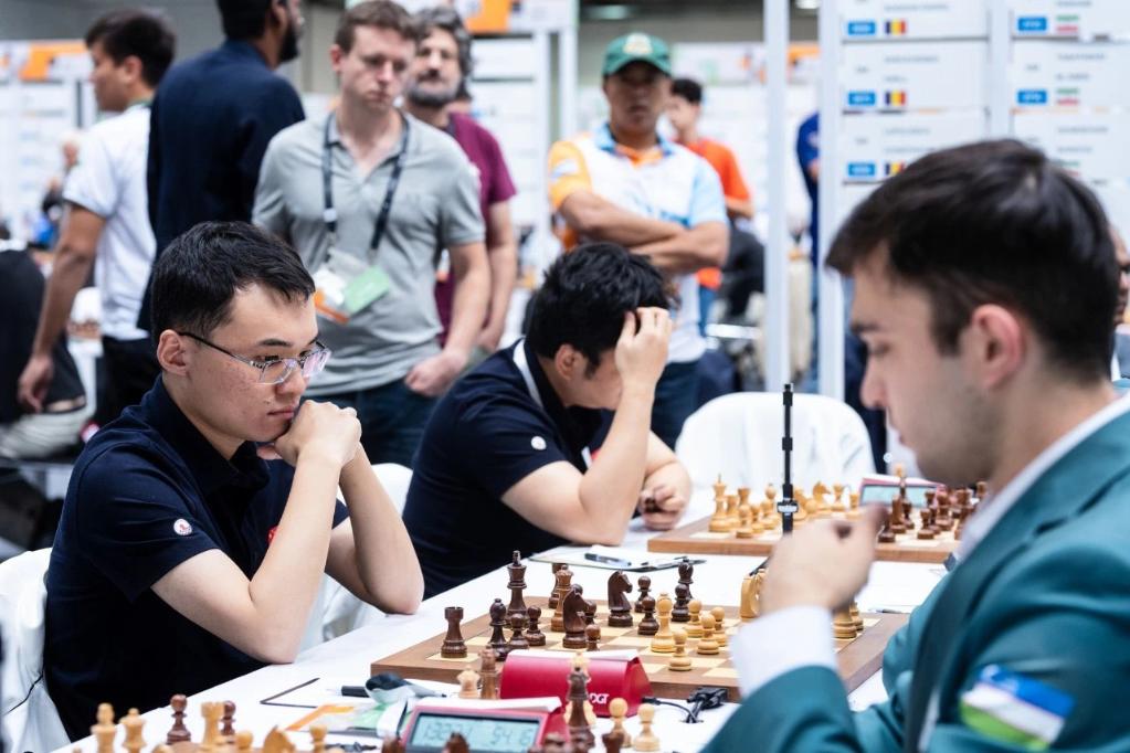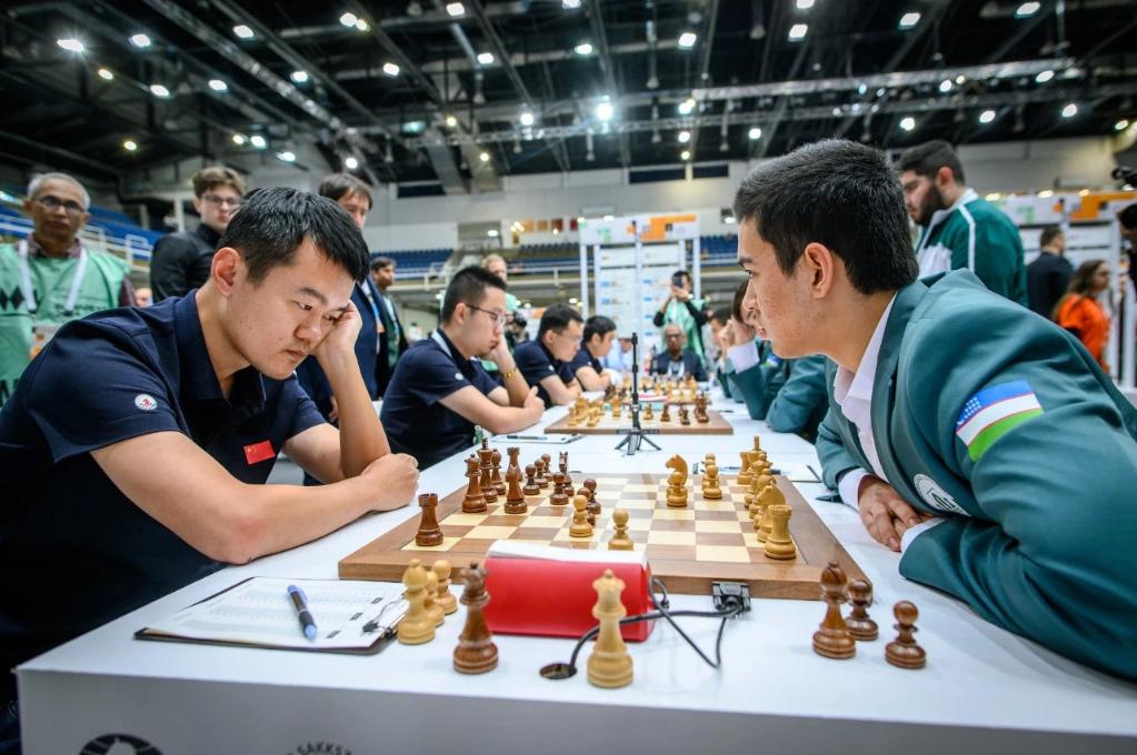 中国男队继杭州亚运会后又一次遭遇上届奥赛冠军乌兹别克斯坦队,在杭州两队打成平手。当日相遇,中国队卜祥志轮休,丁立人、韦奕、余泱漪与王玥出战。世界冠军丁立人在对阵阿卜杜萨托洛夫时一度取得胜势,但随后出现缓手,双方和棋。余泱漪、韦奕则各自告捷,王玥虽苦战后不敌对手,但无碍男队最终2.5:1.5取胜。