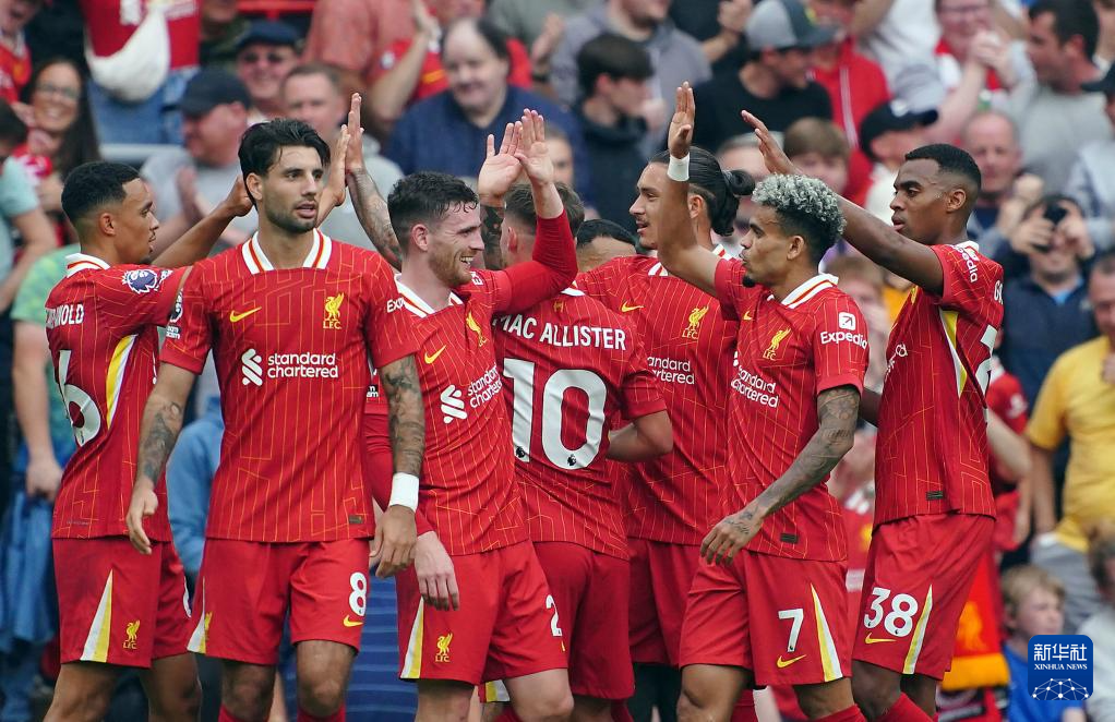 9月21日,利物浦队球员在比赛中庆祝进球。新华社/美联