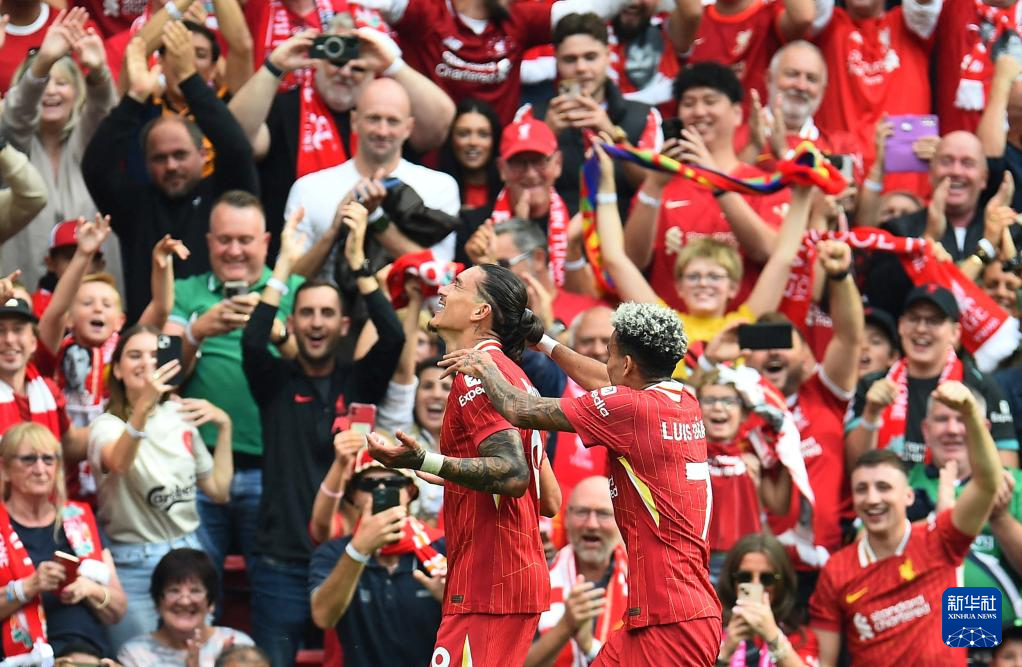 9月21日,利物浦队球员努涅斯(前左)在比赛中进球后庆祝。新华社/路透