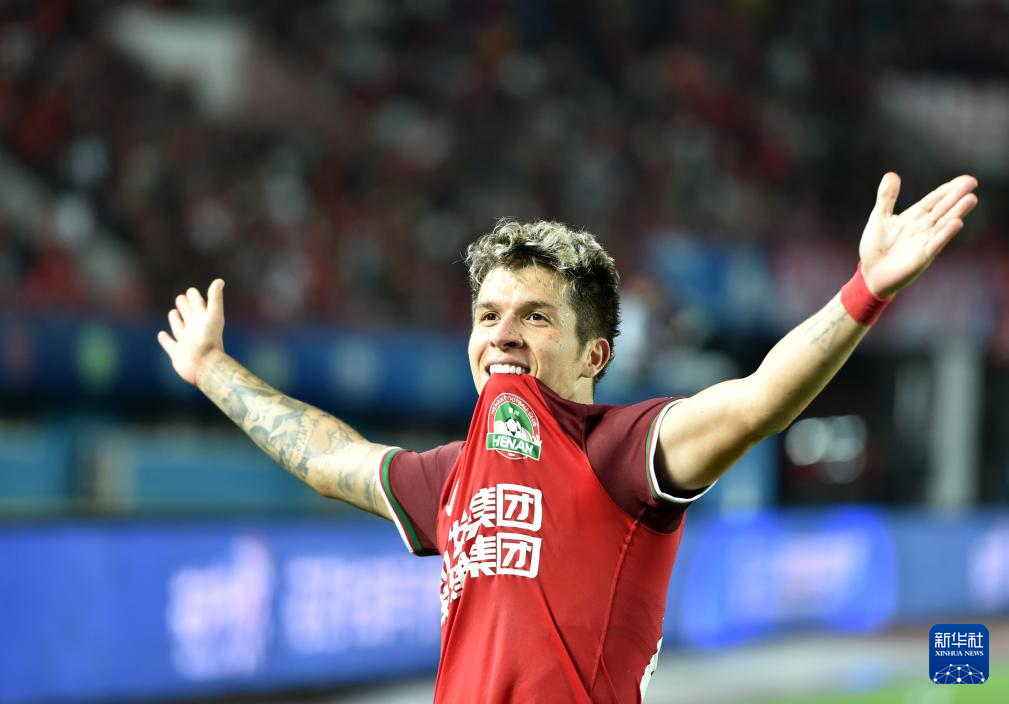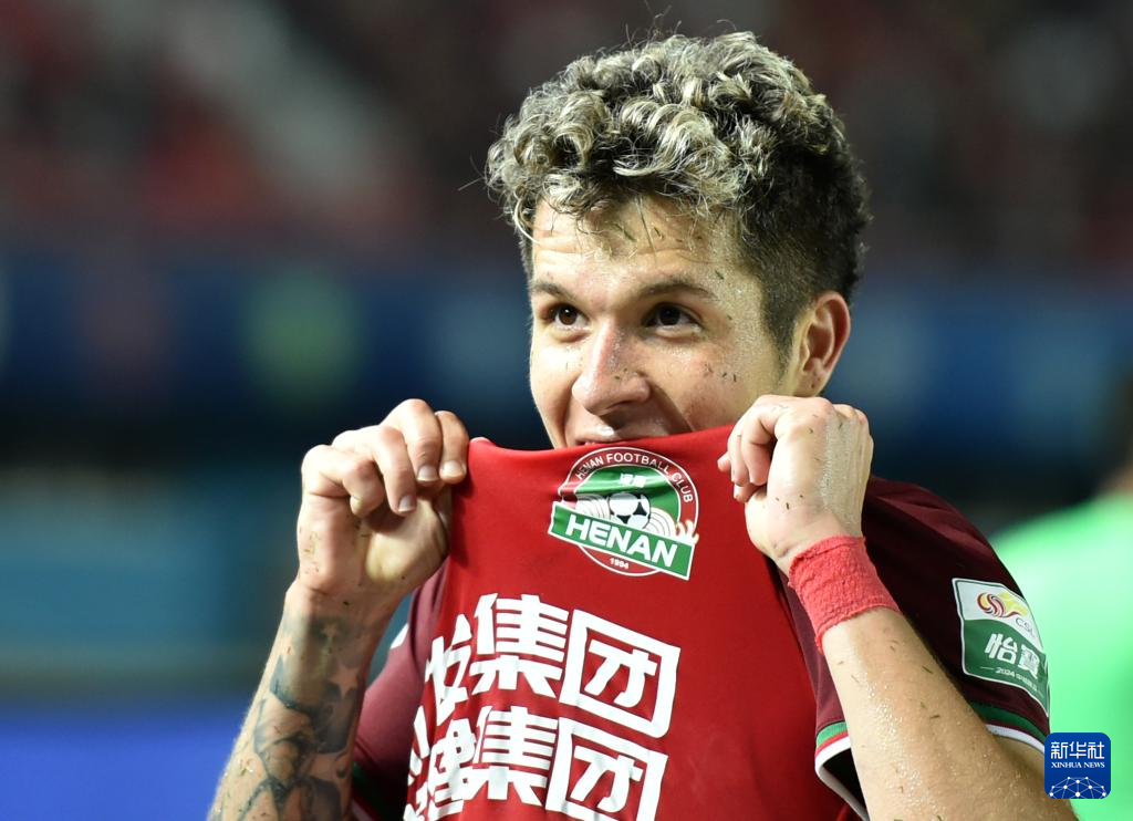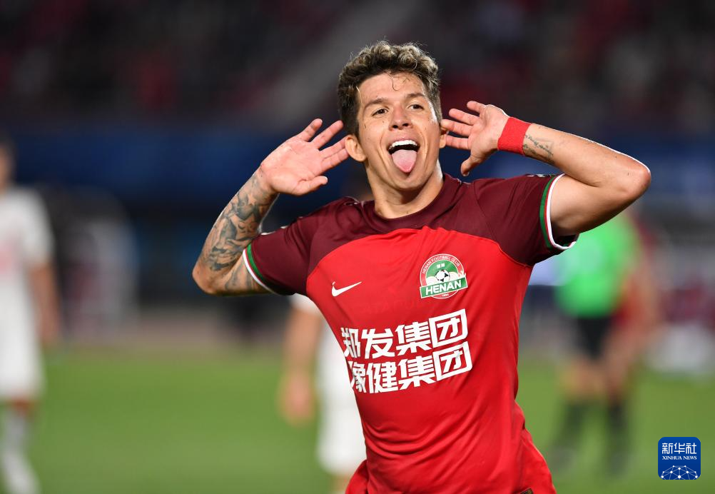 9月21日,河南俱乐部酒祖杜康队球员纳萨里奥在比赛中庆祝进球。