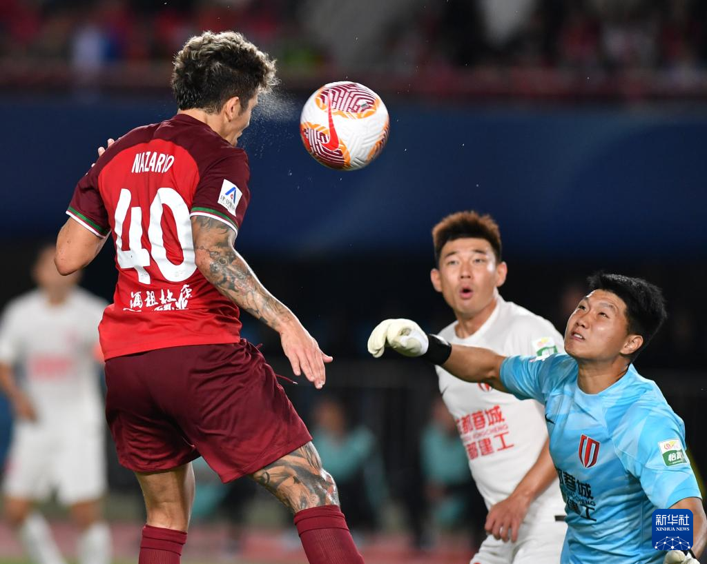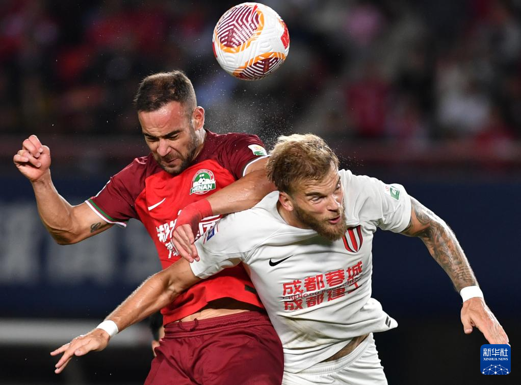 9月21日,河南俱乐部酒祖杜康队球员尼曼贾·科维奇(左)与成都蓉城队球员提莫·莱切特在比赛中争抢头球。