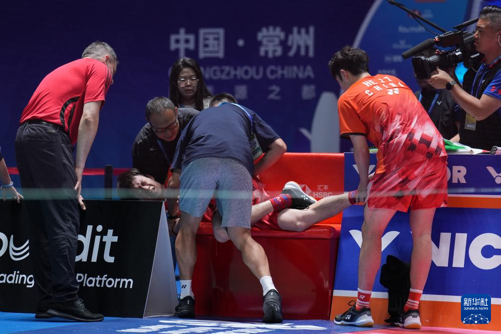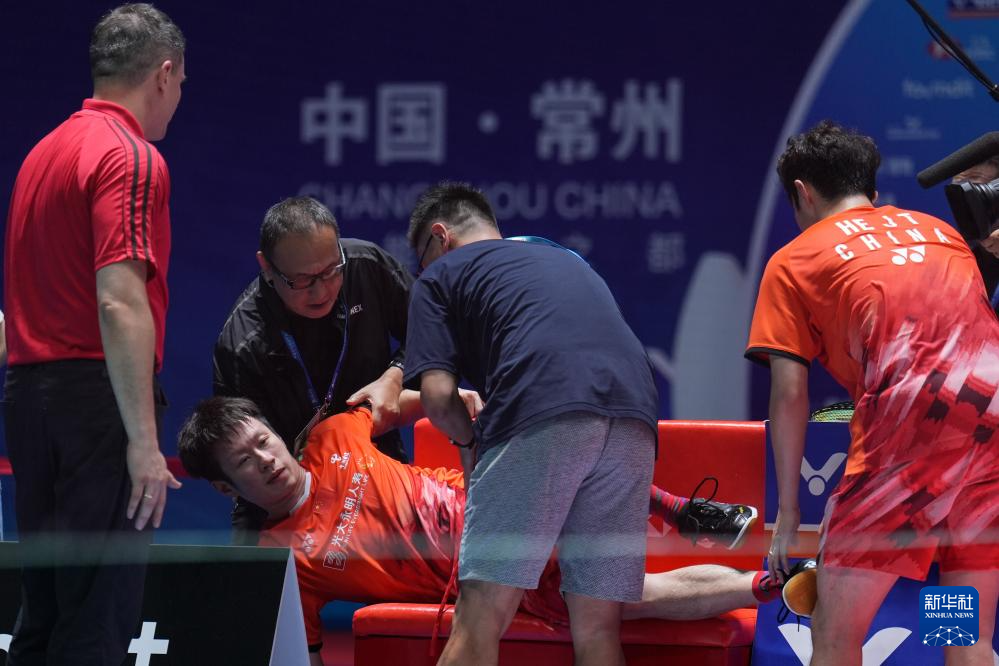 9月22日,任翔宇(下)在比赛中受伤接受治疗。
