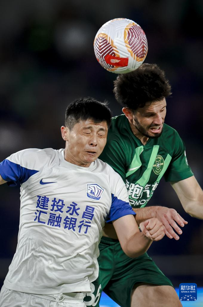 9月22日,浙江队球员卢卡斯(右)在比赛中与沧州雄狮队球员郑凯木争顶头球。