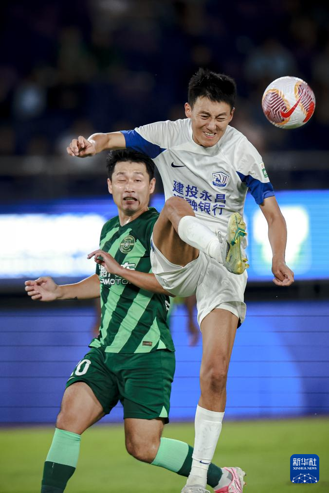 9月22日,沧州雄狮队球员王鹏(右)在比赛中解围。