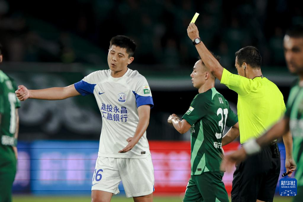 9月22日,主裁判刘威(右)在比赛中向沧州雄狮队球员郑凯木(左)出示黄牌。