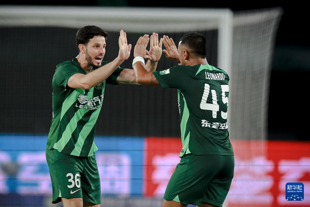 9月22日,浙江队球员莱昂纳多(右)在进球后与队友卢卡斯击掌庆祝。