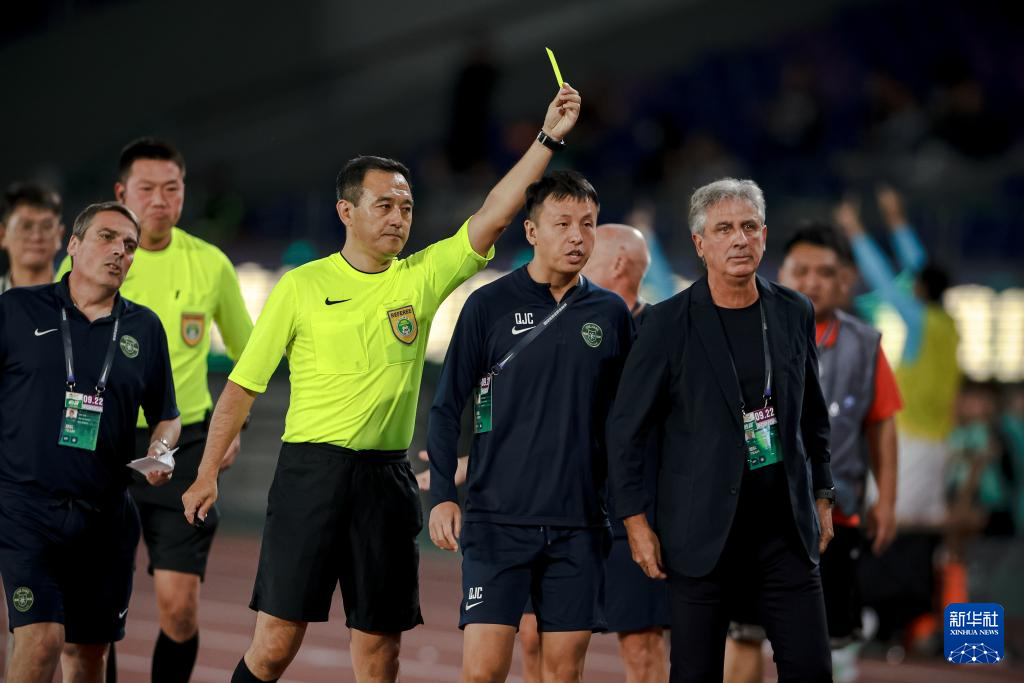 9月22日,主裁判刘威(前右三)在比赛中向浙江队替补席出示黄牌。