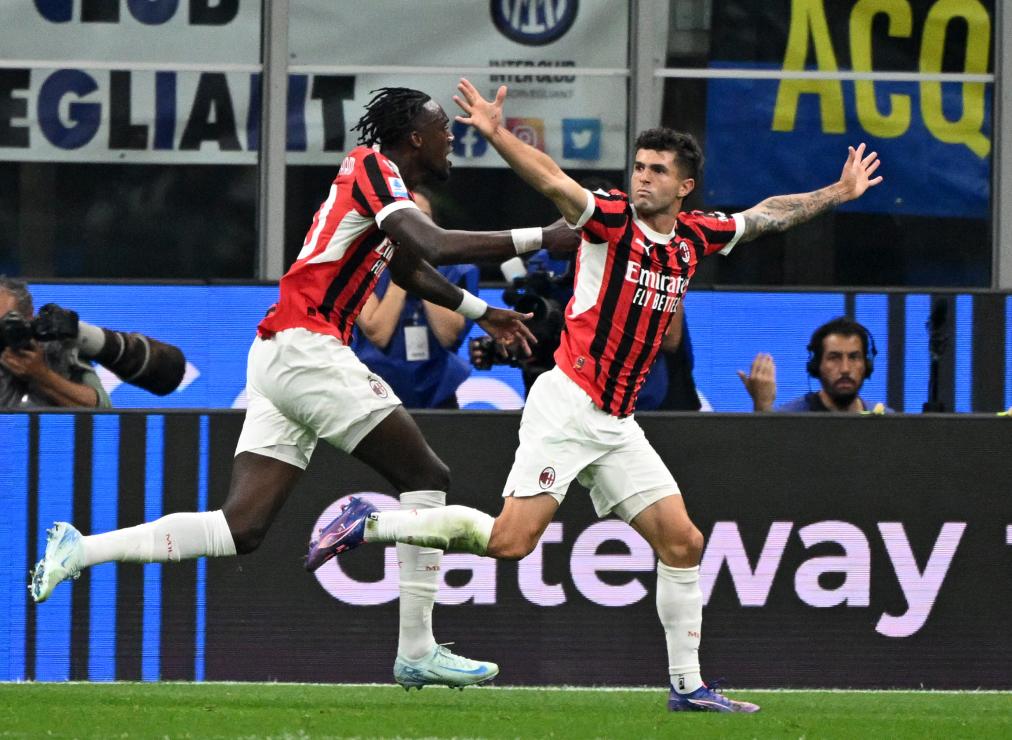 9月22日,AC米兰队球员普利希奇(右)在比赛中庆祝得分。新华社发(阿尔贝托·林格利亚摄)