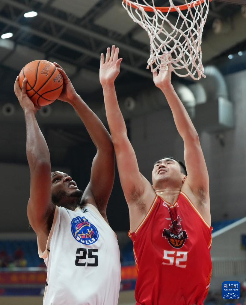 9月24日,香港金牛队球员约书亚·卡尔顿(左)在安徽文一队球员刘仁斌的防守下上篮。
