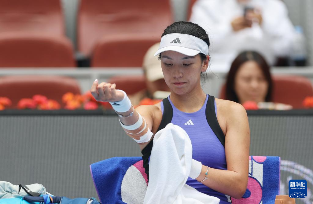 9月27日,王欣瑜在比赛间隙查看受伤的手臂。