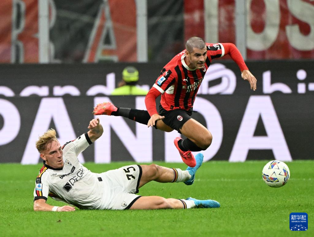 9月27日,AC米兰队球员莫拉塔(右)与莱切队球员皮埃雷在比赛中拼抢。
