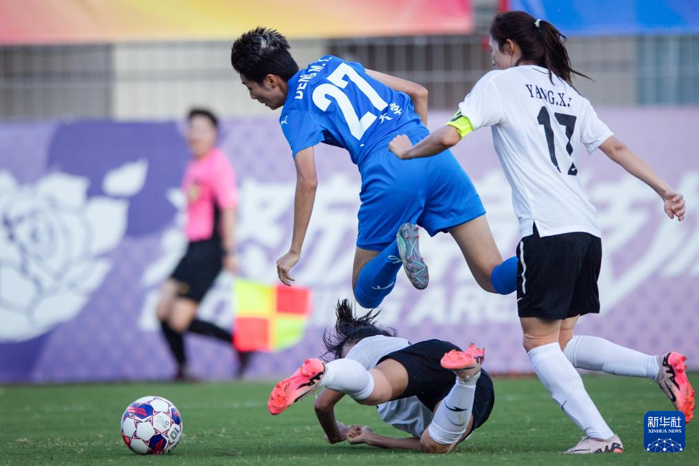 9月28日,武汉车谷江大队球员张琳艳(左一)在比赛中摔倒。