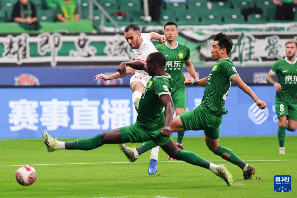 9月28日,北京国安队球员法比奥(左)在比赛中射门得分。