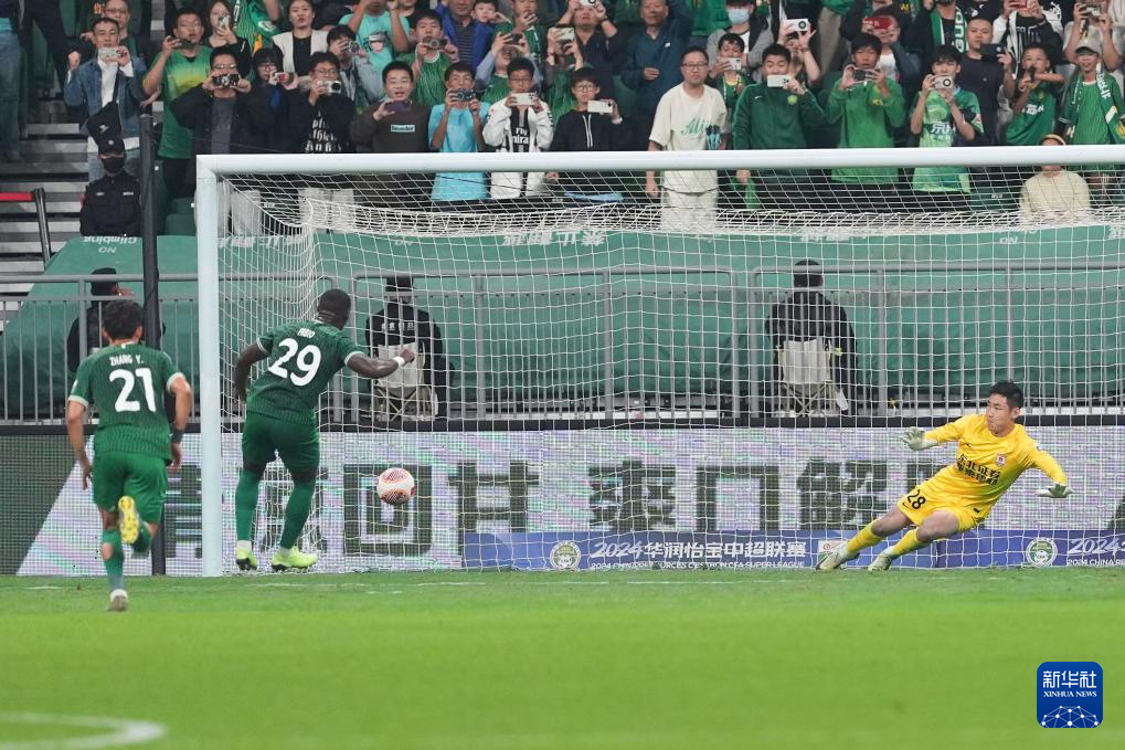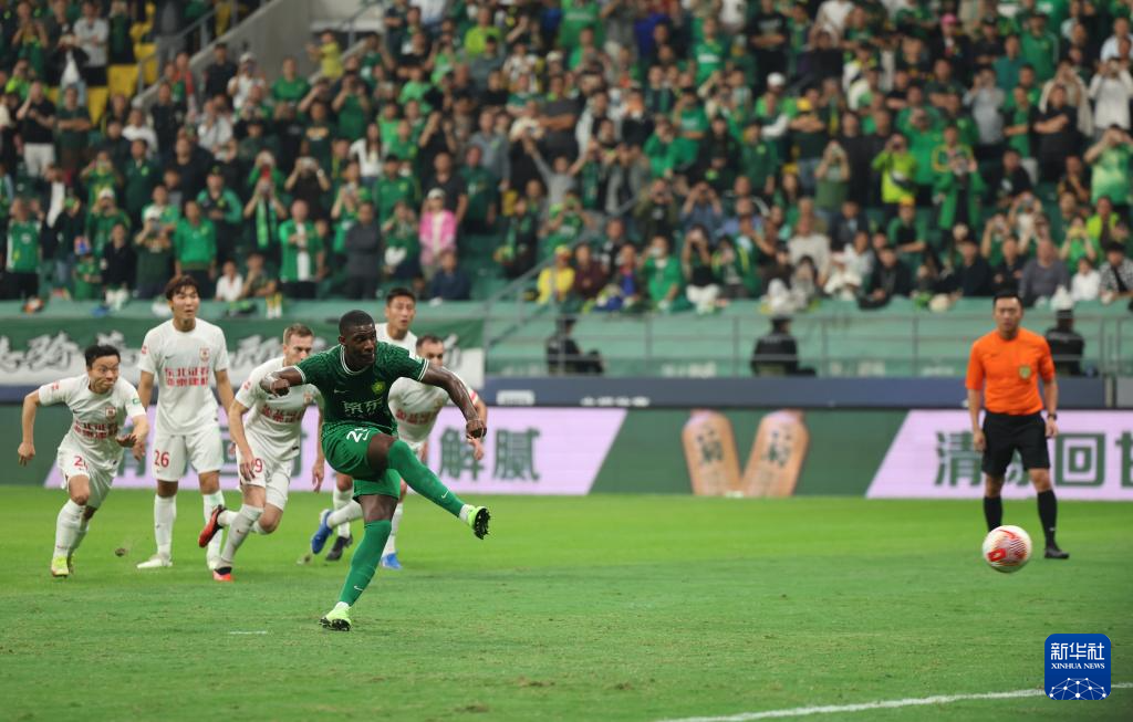 9月28日,北京国安队球员法比奥(前)在比赛中主罚点球破门。