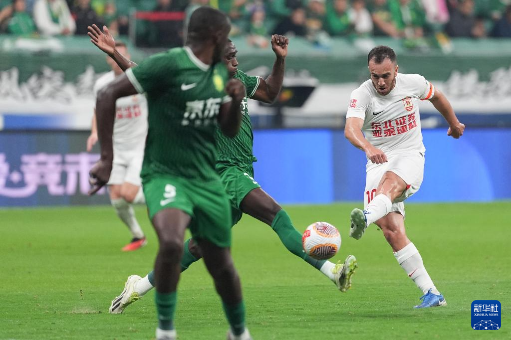 9月28日,长春亚泰队球员塞尔吉尼奥(右)在比赛中射门。