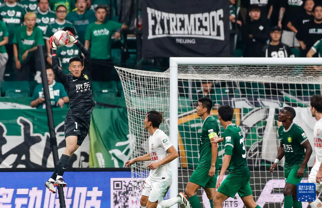 9月28日,北京国安队守门员韩佳奇(左上)在比赛中摘高空球。