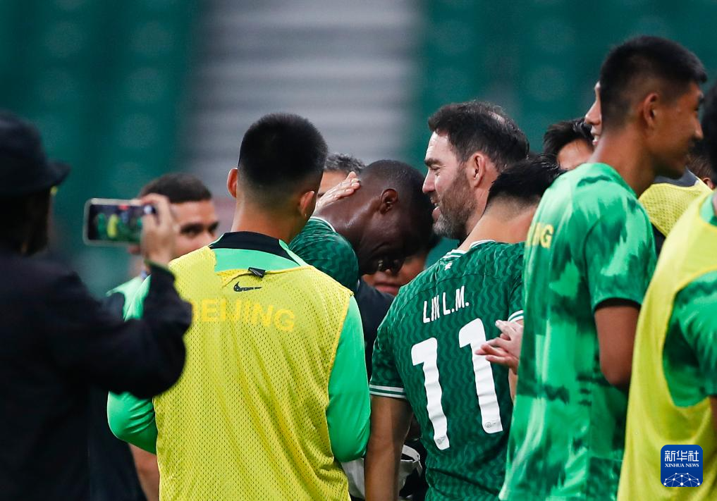 9月28日,北京国安队球员法比奥(中左)和主教练苏亚雷斯(中右)在比赛后。