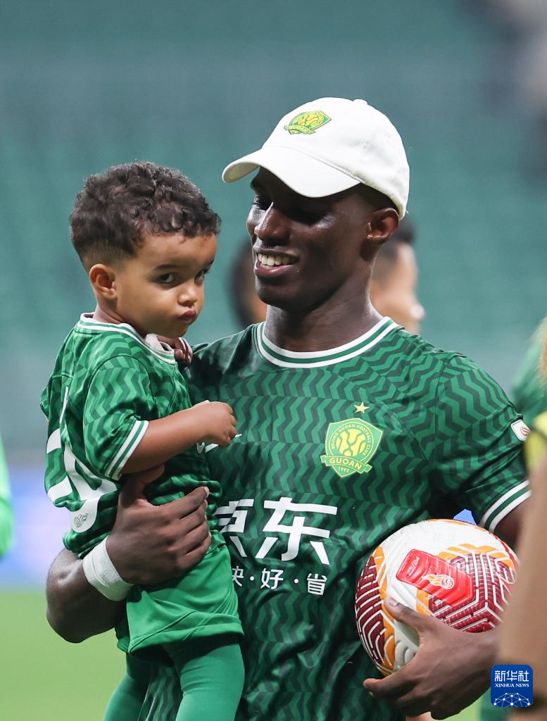 9月28日,北京国安队球员法比奥(右)在比赛后和孩子一起庆祝。