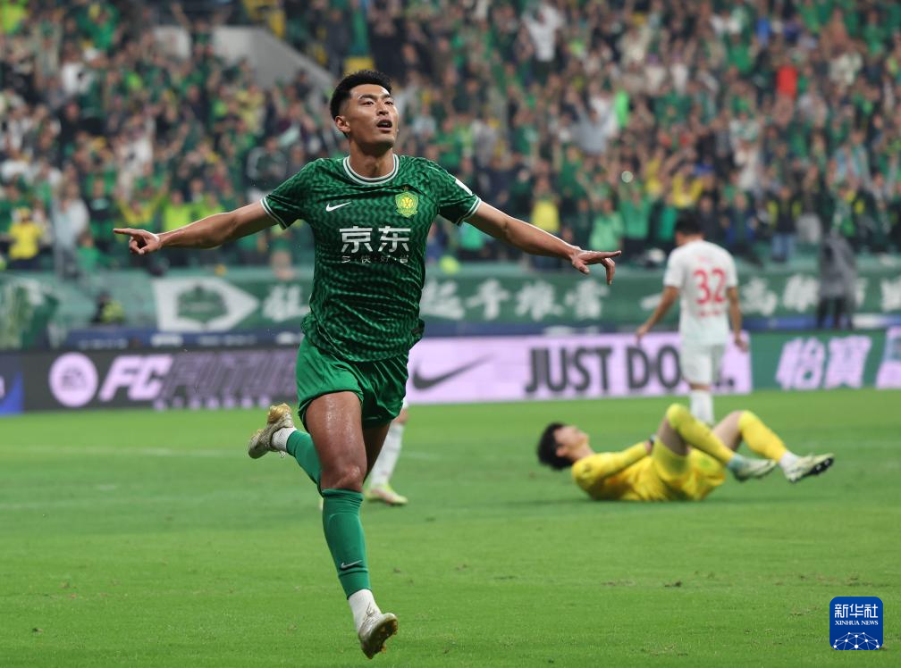 9月28日,北京国安队球员曹永竞(中)在比赛中庆祝进球。
