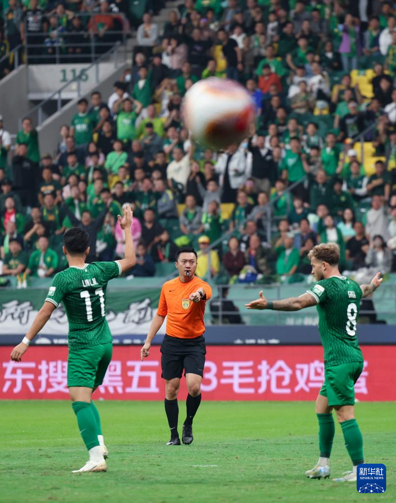 9月28日,主裁判唐顺齐(中)判给北京国安队一粒点球。