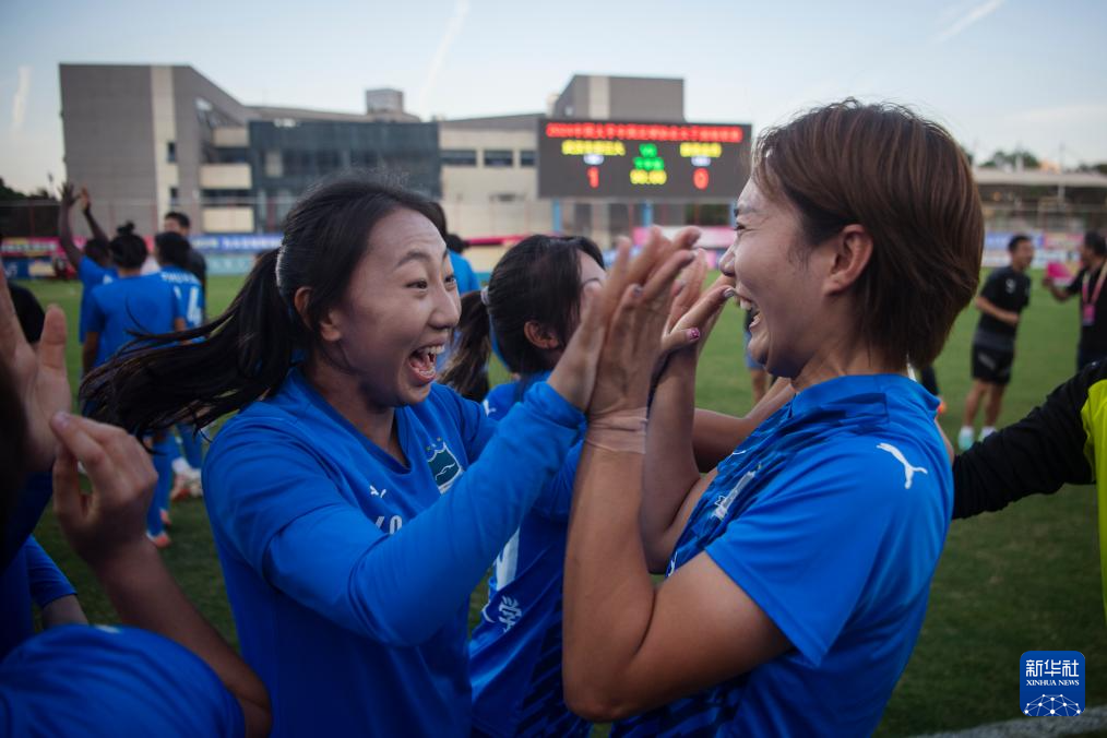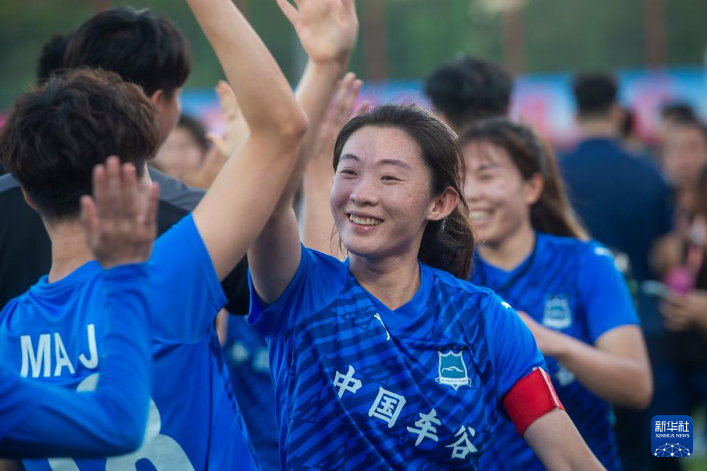 9月28日,武汉车谷江大队球员李婷婷(右一)在比赛后与队友庆祝。