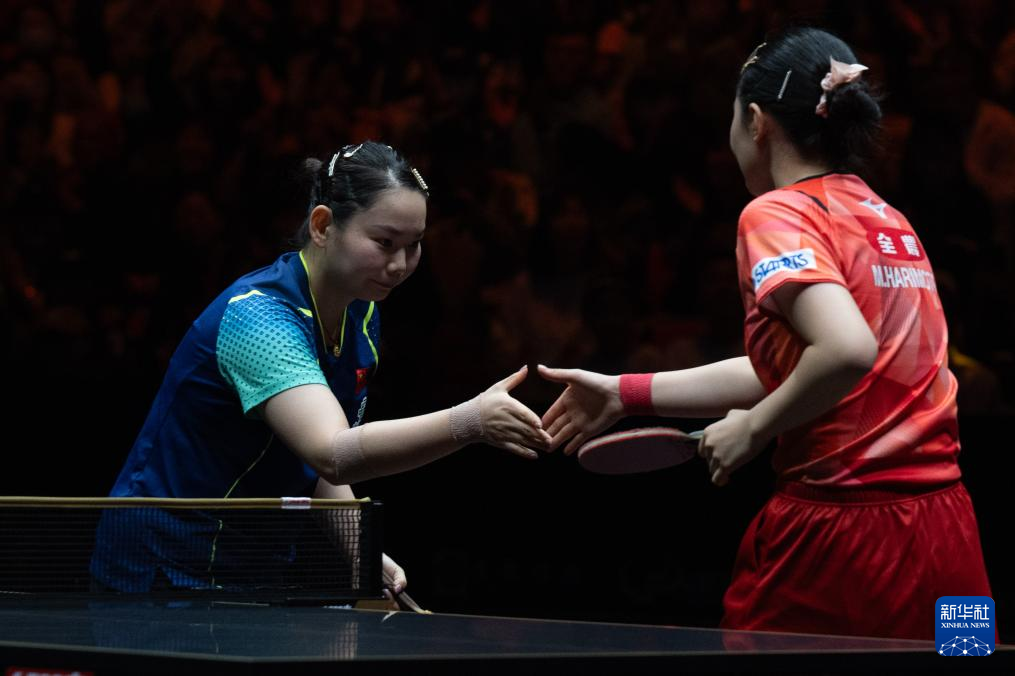 9月29日,中国选手何卓佳(左)在赛后与日本选手张本美和握手致意。
