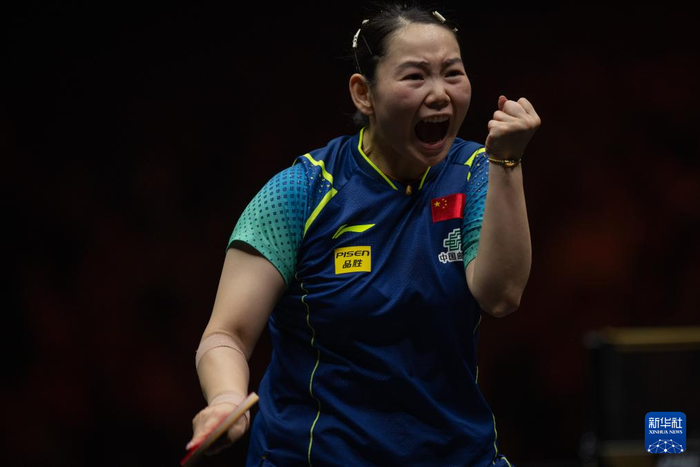 9月29日,中国选手何卓佳在比赛中庆祝得分。