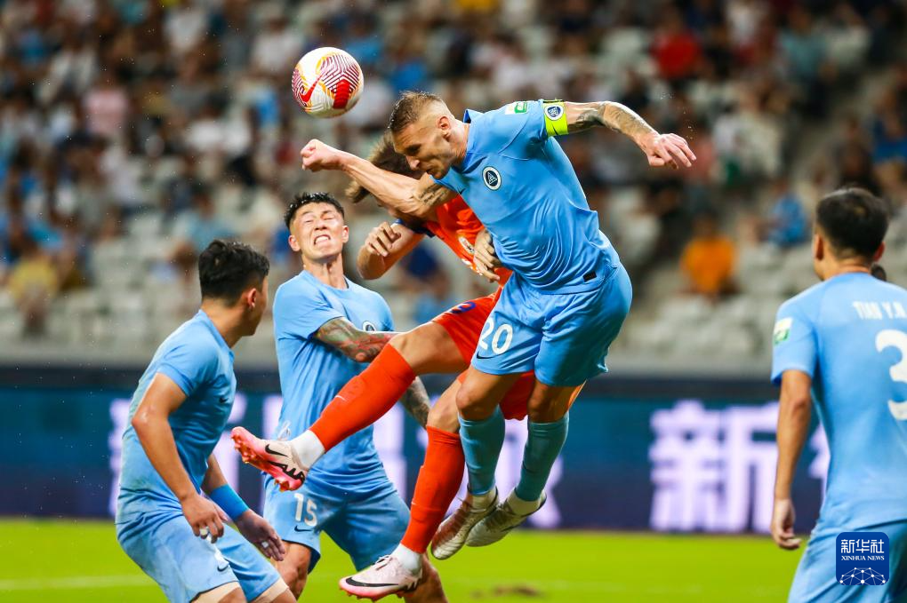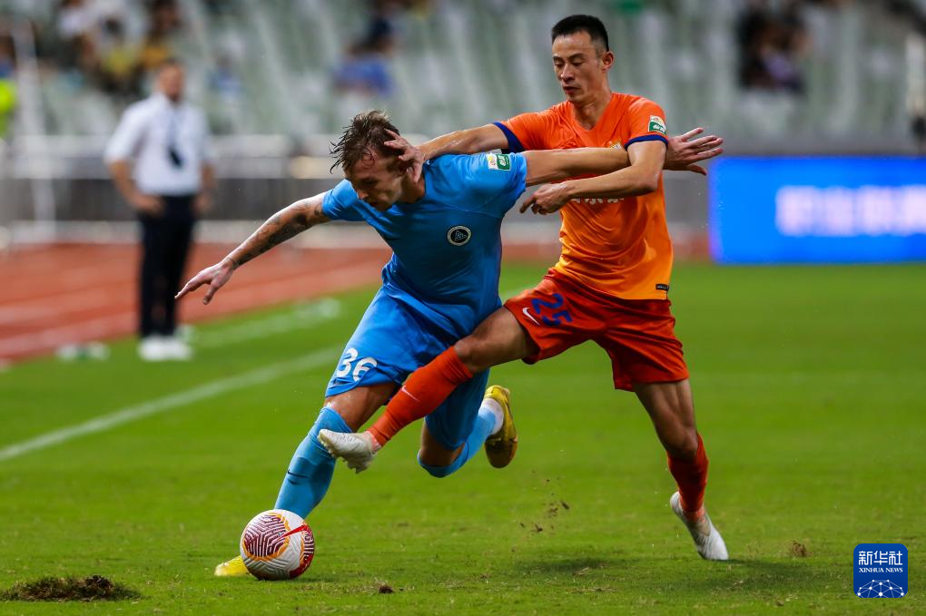 9月28日,深圳新鹏城队球员卡尔采夫(左)在比赛中与山东泰山队球员彭欣力拼抢。